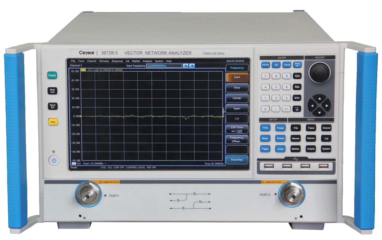 Векторный анализатор Ceyear 3672C-S оснащён двумя портами, которые позволяют производить полный спектр измерений S-параметров: S11, S21, S12 и S22. Это критично важно для всестороннего анализа отражения и передачи сигналов в двухпортовых устройствах, таких как усилители, фильтры, переключатели и другие микроволновые компоненты. Прибор поддерживает выполнение дифференциальных измерений, что значительно улучшает качество анализа двухпроводных линий и других дифференциальных цепей.