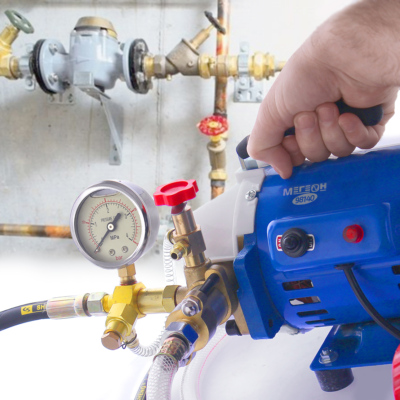 МЕГЕОН 98140 — это опрессовочный насос с электрическим приводом, который специально разработан для гидроиспытаний ёмкостей, проверки герметичности магистралей, трубопроводов, водопровода, сантехники, систем пожаротушения и отопления, технологического оборудования, паровых котлов и многих других применений, идеален для добавления рабочей среды в закрытые контуры. В качестве резервуара, объёмом 17 литров, используется пластиковый контейнер, устойчивый к воздействию разнообразных жидкостей, в котором прибор поставляется. Инструмент оборудован регулируемым редукционным клапаном, на выходе установлен заполненный манометр, рассчитанный на 40 кгс/см2 (4 МПа), с хорошо читаемой шкалой для контроля создаваемого давления; устройством сброса по завершении работ и гибким РВД для подсоединения к испытуемому объекту. Фильтр грубой очистки для защиты от взвеси и крупных частиц.