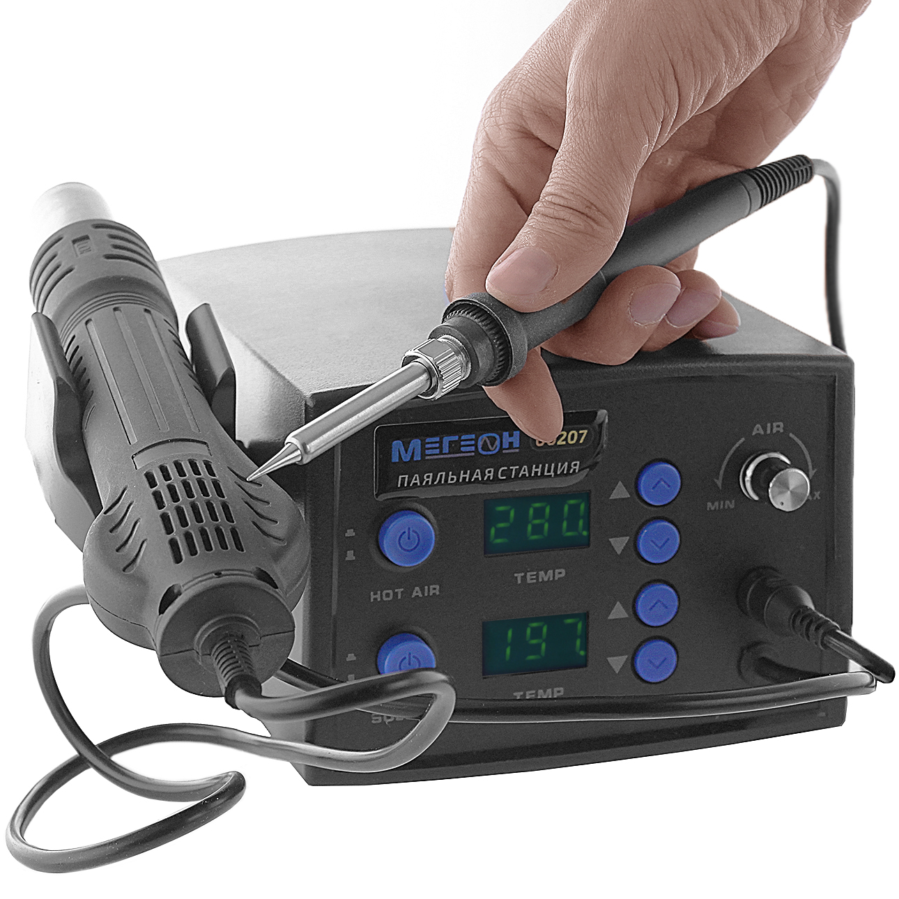 МЕГЕОН 00207 — это комбинированная паяльная станция, имеющая термофен и паяльник с цифровым управлением и индикацией. Нагнетатель, встроенный в рукоятку фена, уменьшает вес и исключает лишние шумы и вибрацию. Система интеллектуального охлаждения нагревателя термофена значительно увеличивает срок его службы. Все компоненты имеют эргономичную форму и защитные приспособления. Приобретение запасных и новых жал облегчает распространённость типоразмера 900М. За счёт самого широкого ассортимента наконечников в этой серии расширяется перечень выполняемых работ. Микропроцессор поддерживает температуру с высокой точностью, снижая вероятность перегрева радиокомпонентов в процессе технологической операции, а функция защиты от статического электричества в полной мере исключит поражение радиоэлектронной аппаратуры.