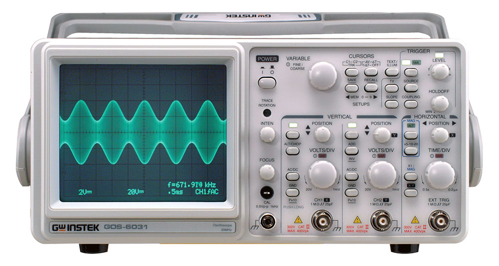 ЭЛТ, используемая в качестве дисплея, обладает высокой интенсивностью свечения, обеспечивая четкое изображение даже при высокоскоростной развертке. Измерительные входы GW Instek GOS-6031 с максимальной чувствительностью 1 мВ/дел. и активным сопротивлением 1 МОм выдерживают напряжение номиналом до 400 В при прямом подключении и до 600 В при использовании делителя, что позволяет применять прибор для контроля параметров силовых систем. Параллельное отслеживание сигналов по двум каналам возможно в поочередном или попеременном режиме, для чего используется коммутатор с частотой переключения 250 кГц. В режиме Z-входа доступна функция яркостной модуляции входного сигнала.